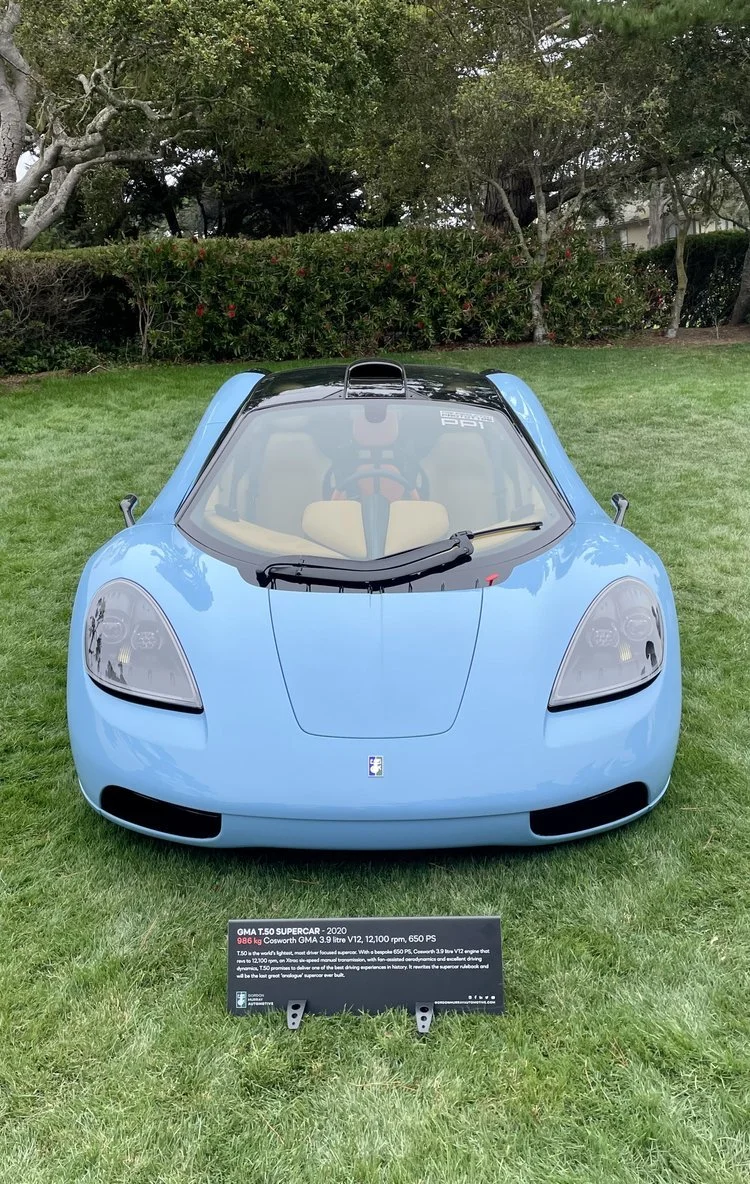 The concours is always a source of inspiration for me and I wanted to share a few of my favorite cars from the event, starting with the first vehicle I saw: a baby blue GMA T.50. It’s the brainchild of Gordon Murray, who found great success as a Formula 1 engineer and later designed the McLaren F1 in the 90’s. The F1 is hailed as one of the greatest road-legal cars ever built, and Gordon describes the T.50 as a modern-day version that sticks to tried and true principles which we share at Shoreline Bespoke: ultra-lightweight design, a high-revving naturally aspirated engine, a manual transmission, and an unwavering focus on providing the ultimate driving experience.